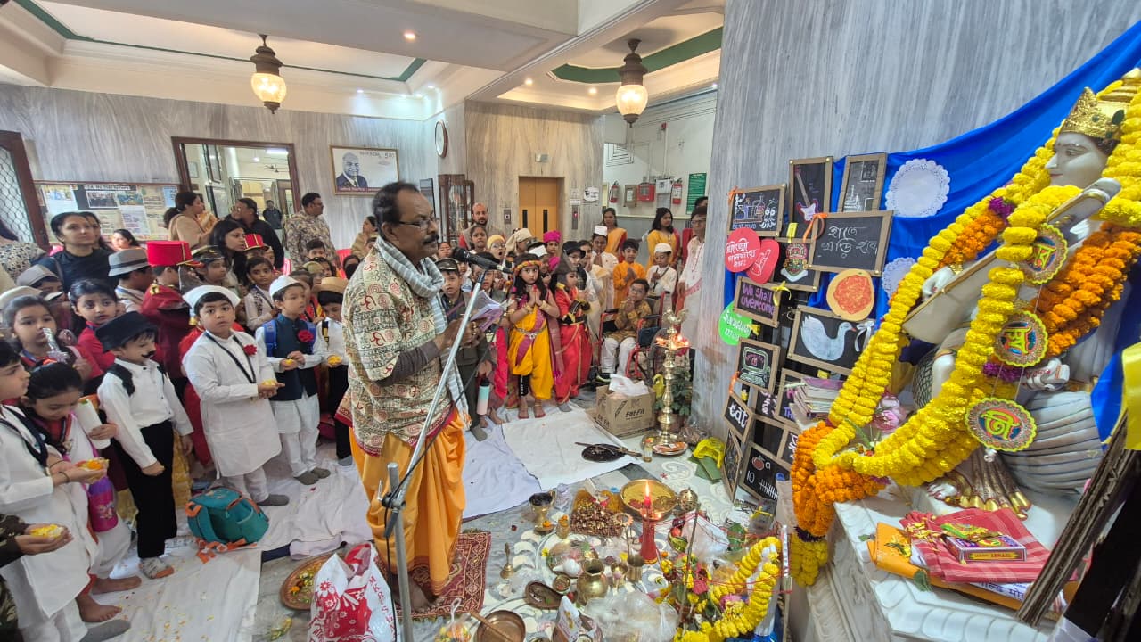 The celebration commenced with the traditional rituals, conducted in a serene and spiritual atmosphere. Students and teachers gathered in ethnic attire to seek blessings for academic excellence and success.